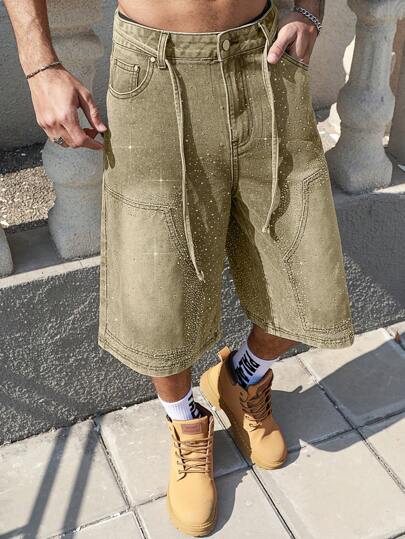 ROMWE MEN Street Life Men's Sparkling Diamond Decoration Denim Capri Shorts - Khaki - View 1