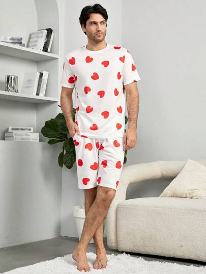 Men 1pc Heart Print Tee & 1pc Shorts PJ Set - White - View 1