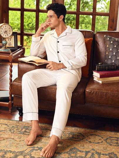 SHEIN Men Contrast Piping Lapel Collar Top & Pants PJ Set, White Pajama Set, Fall Clothes - White - View 1