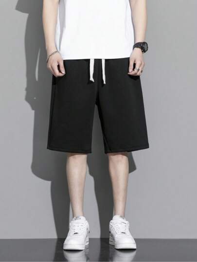 Men Drawstring Waist Shorts - Black - View 1