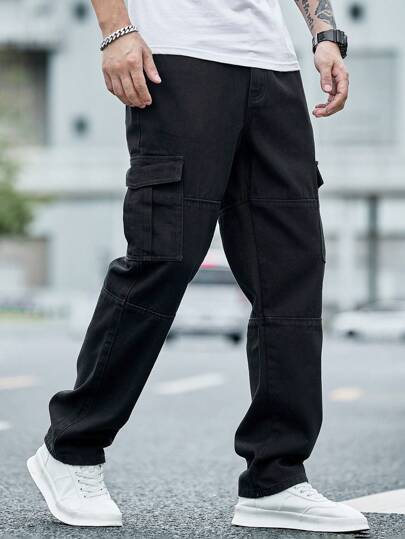 Manfinity Homme Men Cotton Flap Pocket Side Cargo Jeans Straight Leg Long Jean Plain Black Going Out Street Wear Friends Work Going Out Urban Vacation College - Black - View 1