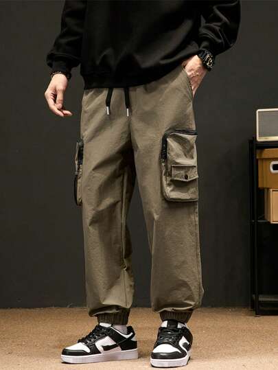 Men Flap Pocket Side Drawstring Waist Cargo Pants - Army Green - View 1