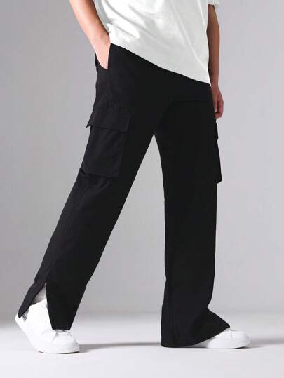 Manfinity Homme Men Flap Pocket Side Split Hem Cargo Trousers - Black - View 1