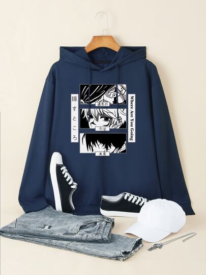 Men Japanese Letter & Figure Graphic Drawstring Hoodie - Navy Blue - View 1