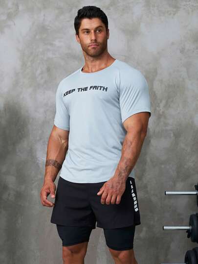 Men Letter Graphic Sports Tee - Light Grey - View 1