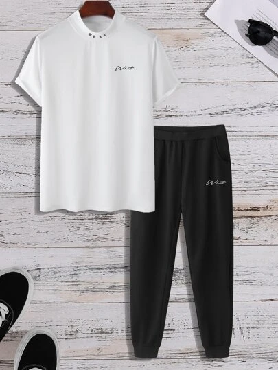 Manfinity Homme Men Letter Graphic Tee & Joggers - Black and White - View 1