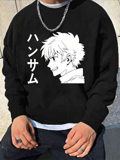 Manfinity RebelGame Men's Anime Character & Japanese Letter Printed Sweatshirt - Black - View 1