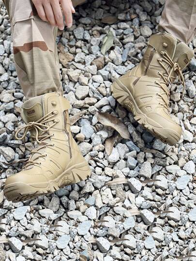 Men Side Zip Lace-up Front Hiking Boots - Khaki - View 1