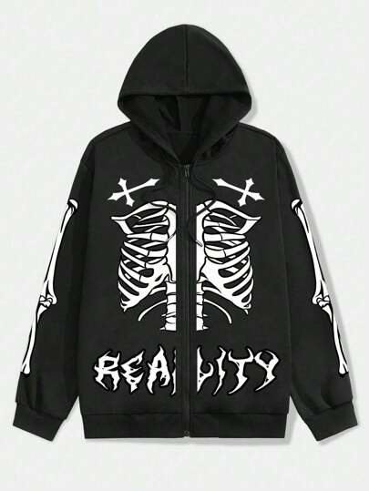 ROMWE MEN Goth Men Skeleton Print Zip Up Hoodie - Black - View 1