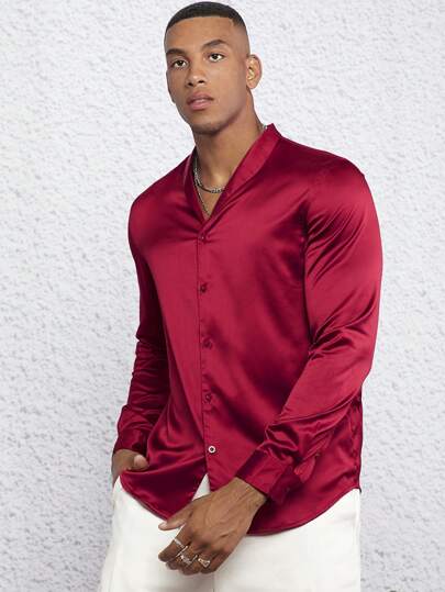 GENTILAND Men Solid Button Up Satin Shirt - Burgundy - View 1