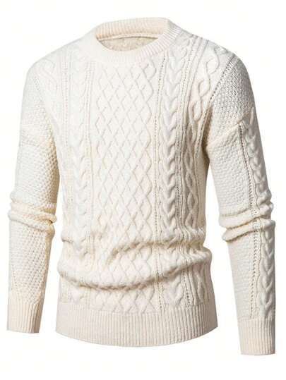 Men's Loose Fit Crew Neck Cable Pattern Textured Long Sleeve Pullover Knit Sweater, Suitable For Casual Or Formal Wear, Fall/Winter - Apricot - View 1