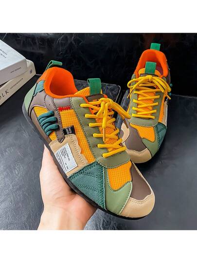 Men's Retro Breathable Mesh Sneakers, Slip-Resistant Casual Running Shoes With Vintage Green/Beige Color Block Design, Low-Top Round Toe Lace-Up Closure, For Spring/Summer/Autumn - Green - View 1