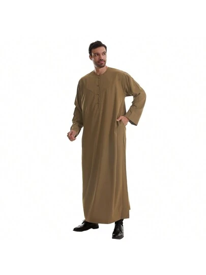 Men's Solid Color Handmade Button Round Neck Robe, Suitable For Ramadan And Eid Al-Fitr, Elegant Islamic Traditional Clothing - Coffee Brown - View 1