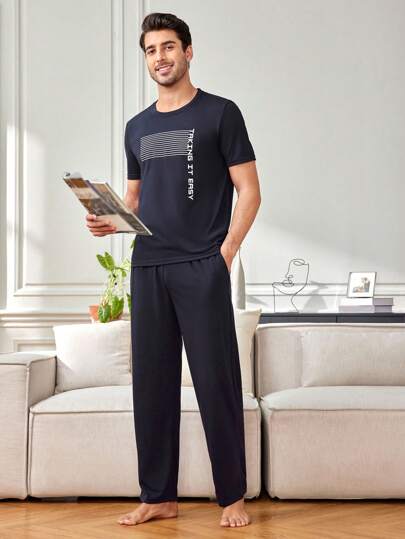 Men's Striped Print Short Sleeve Homewear Set - Navy Blue - View 1