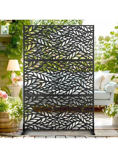 Metal Privacy Screen, Freestanding Decorative Privacy Screen With Stand, Outdoor Privacy Fence Panels For Deck Balcony Patio - Leaf Pattern-black - View 1