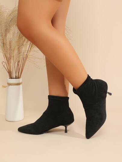 Minimalist Point Toe Heeled Faux Suede Sock Boots - Black - View 1