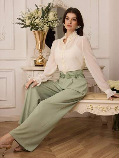 Modelyn Women's Romantic Floral Ribbon Waist Loose Fit Casual Pants - Green - View 1