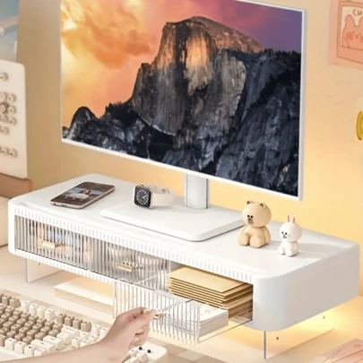 Monitor Stand, 21inch Long Monitor Stands Riser For Monitors, Pull-Out Door With Storage Organizer Stand For Desk, 2 Tier Desk Shelf For Laptop, Pc, Printer, Computer, TV - White - View 5