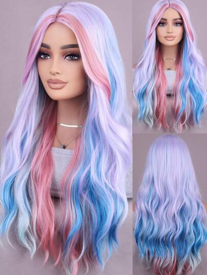 Multi-Color Gradient Wig Long Wavy Curly Wig Natural Synthetic Heat Resistant Fiber Wig For Everyday Party Use (26 Inches) - Multicolor - View 1