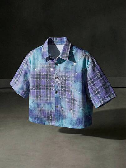 NEON BLANC Men's Rhinestone Print Short Sleeve Denim Shirt - Purple - View 1