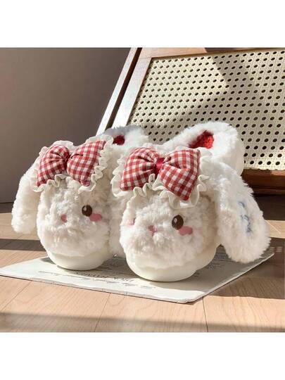 New Cute Plush Indoor Slippers, Adorable Big Ear Rabbit Design, Warm Thermal Lined, Comfortable & Non-Slip Plush Slippers For Home, Students - White - View 1
