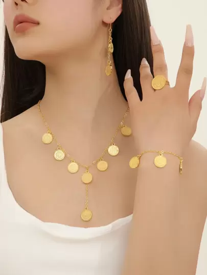 New European And American Fashionable Multi-Layered Engraved Coin Chain Necklace Set - Yellow Gold - View 5
