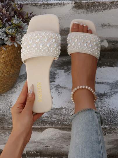 New Fashion Plus Size Luxury Non-Slip Square Toe Mule Rhinestone & Pearl Decor Vacation Beach Slides Sandals For Women - Beige - View 1