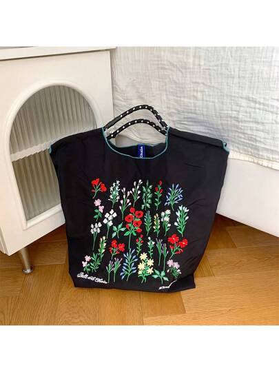 New Fashionable Embroidered Floral Pattern Large Capacity Portable Shopping Bag Nylon Tote Handbag - Black - View 1
