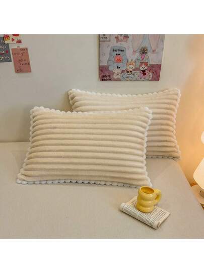 New High-Density Milk Plush Ball Pillow Case, Striped Rabbit Fur Fluffy Ball Thickened Snowball Pillow Cover With Zipper - Beige - View 1