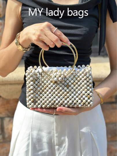 New Ins Niche Design High-Quality Fashionable Retro Handmade Beaded Shell Bamboo Circle Handbag, Suitable For Party And Vacation - Beige - View 1