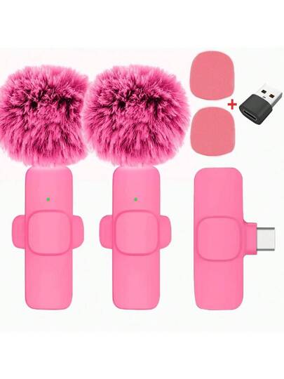 New Pink Wireless Lavalier Microphone With Windshield Adapter Portable Audio Video Recording Compatible With Iphone Android PC Camera Live Game Mobile Phone Compatible With Iphone Android Phone For Summer Vacation, Audio/Video Recording, Interviews, Gaming & Live Streaming Mini Microphone - Hot Pink - View 1
