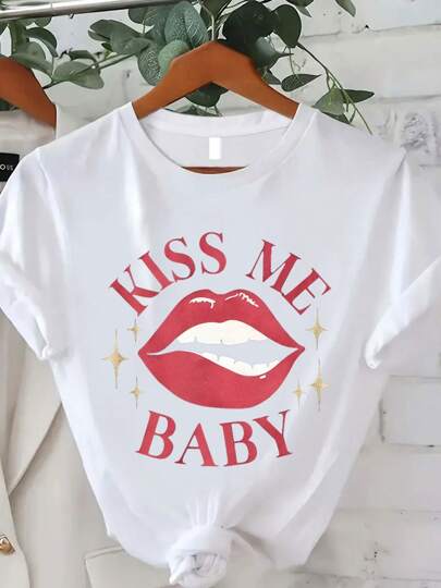 Women's Lip Print T-Shirt, Summer Women's Fashion, Casual, Comfortable, Soft, Daily Outdoor Sports, Fitness, Breathable Round Neck Short Sleeve T-Shirt - White - View 1
