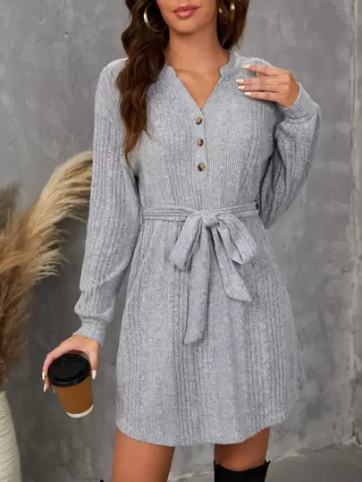 SHEIN LUNE Notched Neckline Belted Dress - Light Grey - View 1