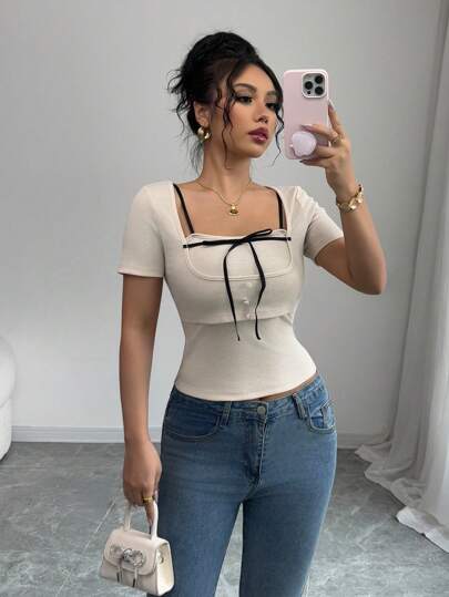 Chiquease Oatmeal Color Knit 2 In 1 Sleeveless Tank Top For Women - Beige - View 1