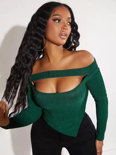SHEIN SXY Off Shoulder Cut Out Hanky Hem Tee - Dark Green - View 1