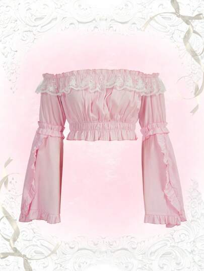 ROMWE Kawaii Off Shoulder Frill Trim Ruched Bust Blouse - Pink - View 1