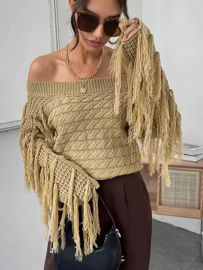 Off Shoulder Tassel Trim Cable Knit Jumper - Khaki - View 1
