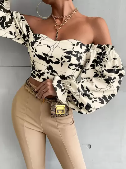 SHEIN VCAY Off The Shoulder Plants Print Shirred Back Crop Blouse - Black and White - View 1