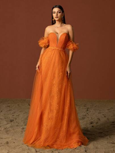 Orange Off Shoulder Mesh Elegant Evening Prom Dress - Orange - View 1
