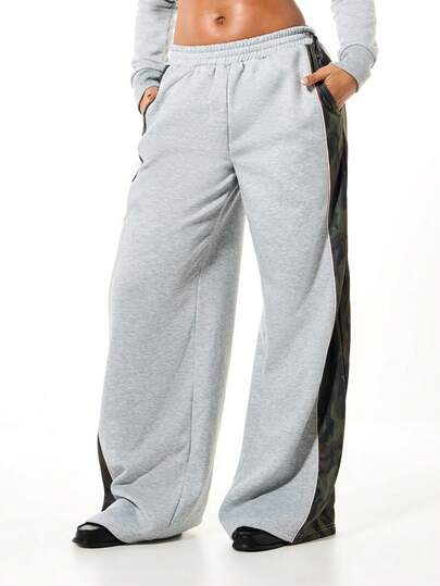 SUMWON WOMEN Oversized Wide Leg Camouflage Side Panel Jogger Sweatpants With Elastic Waistband Casual Drawstring Pants - Grey - View 1