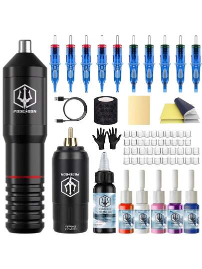 POSEIDON Tattoo Gun Kit, Tattoo Pen Kit, Tattoo Machine Kit With Power Supply 6 Tattoo Inks, 10pcs Tattoo Needles For Beginers - Black - View 1