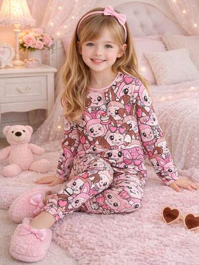 Pajama Set Young Girl Cute Cartoon Rabbit Print Girls Pyjama Set Casual Comfortable Round Neck Long Sleeve Home Clothes Two Pieces Set - Pink - View 1