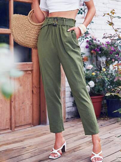 SHEIN Paperbag Waist Trousers - Army Green - View 1