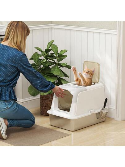 PawHut Stainless Steel Litter Box, Enclosed Metal Litter Tray With Scoop - White - View 1