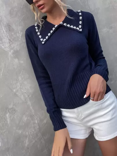Pearl Beaded Peter-pan Collar Jumper - Navy Blue - View 1