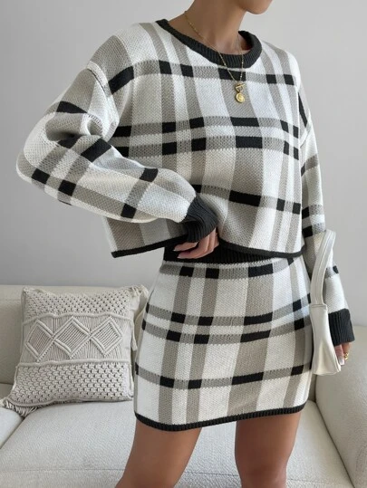 Plaid Pattern Drop Shoulder Jumper & Knit Skirt - Multicolor - View 1