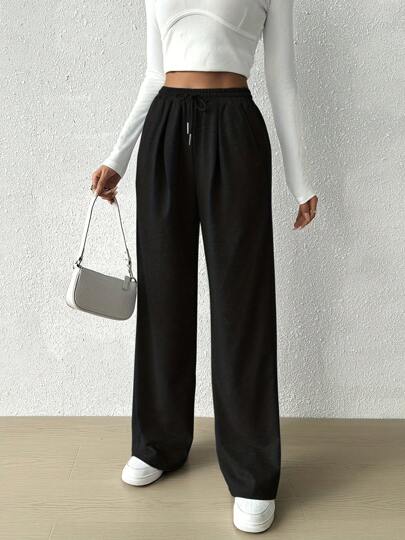 Plain High Waist Drawstring Pleated Side Pockets Loose Wide Leg Pants - Black - View 1