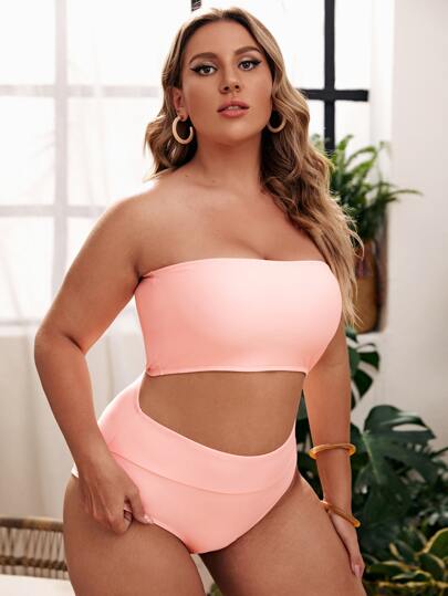 Plus Size Bandeau High Waisted Bikini Set Summer Beach - Pink - View 1