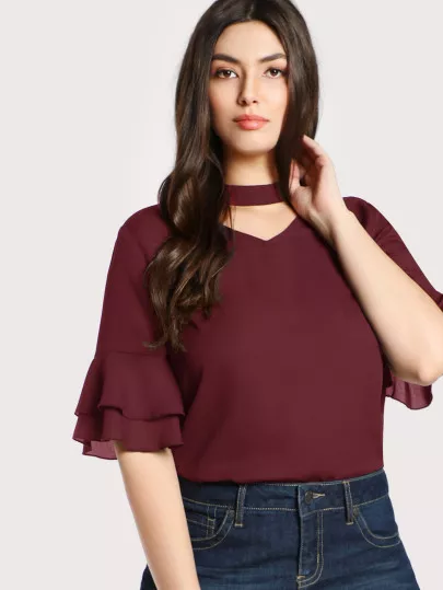 SHEIN Plus Choker Neck Layered Sleeve Top - Burgundy - View 1