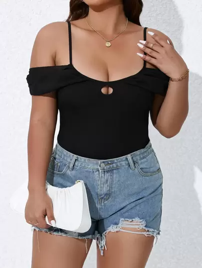 Calvaya Plus Cold Shoulder Cut Out Front Bodysuit - Black - View 1